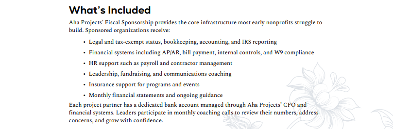 Focus on the work you were called to do and let AHA manage the administrative lift behind the scenes. Fiscal Sponsorship, administered under the Aha Projects’ umbrella, offers a practical way for mission-driven leaders to step into their work with confidence, knowing the compliance, bookkeeping, and operational safeguards are in expert hands.