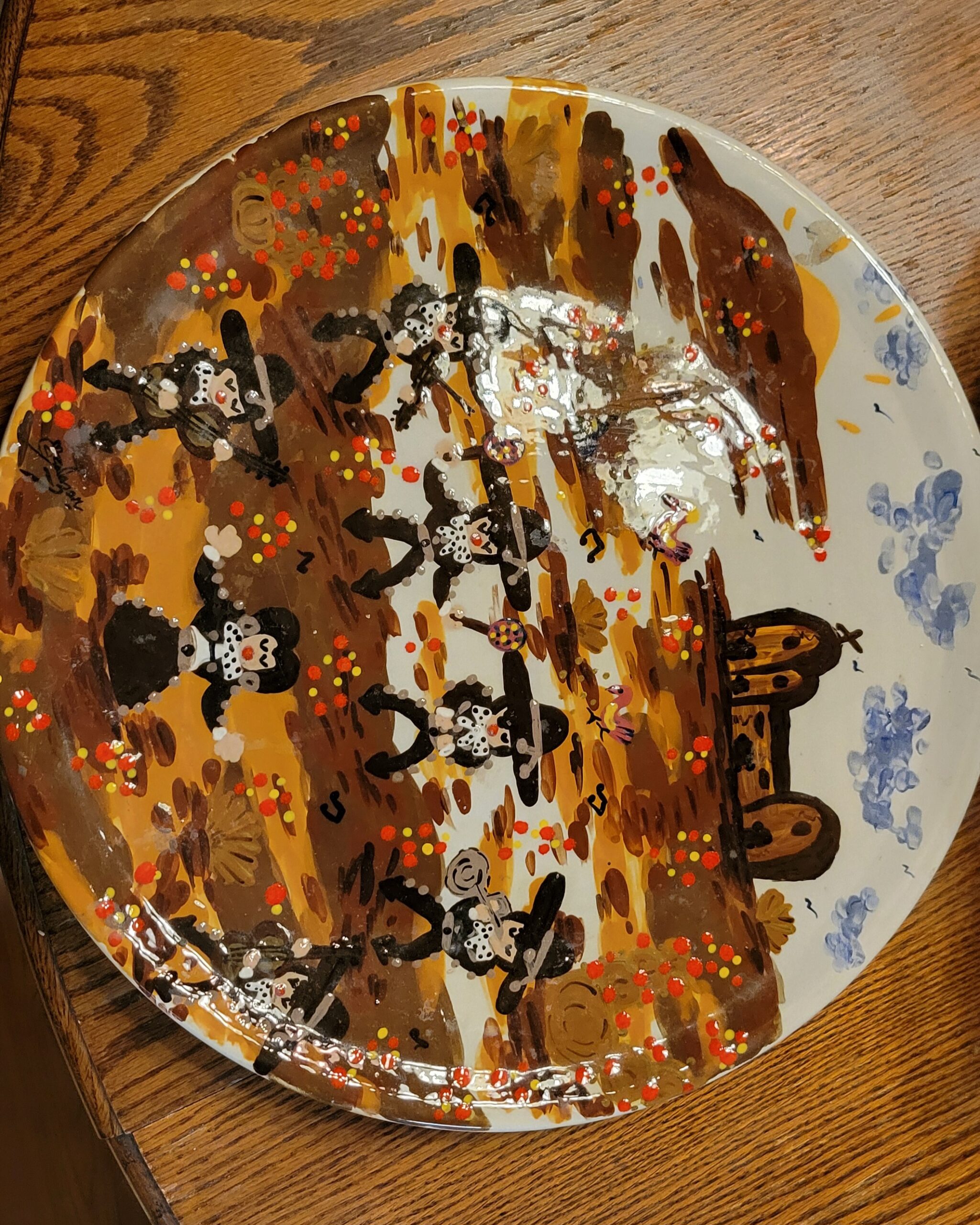 Hundreds and thousands of years ago paintings were done in caves all over the world, France, Spain, Africa. Petroglyphs and beautifully done pottery are constantly uncovered all over the world as well. In nearly all cases little is known of the creator or artist. Was it a man, a woman or even a young child with no instructor or professor to teach them? We know who painted the last supper in a wall in Milano Italy, and who painted the ceiling of the Sistene Chapel we also know who painted the walls in Mary Lou’s home and who captured the essence of familial get together on fired pottery.